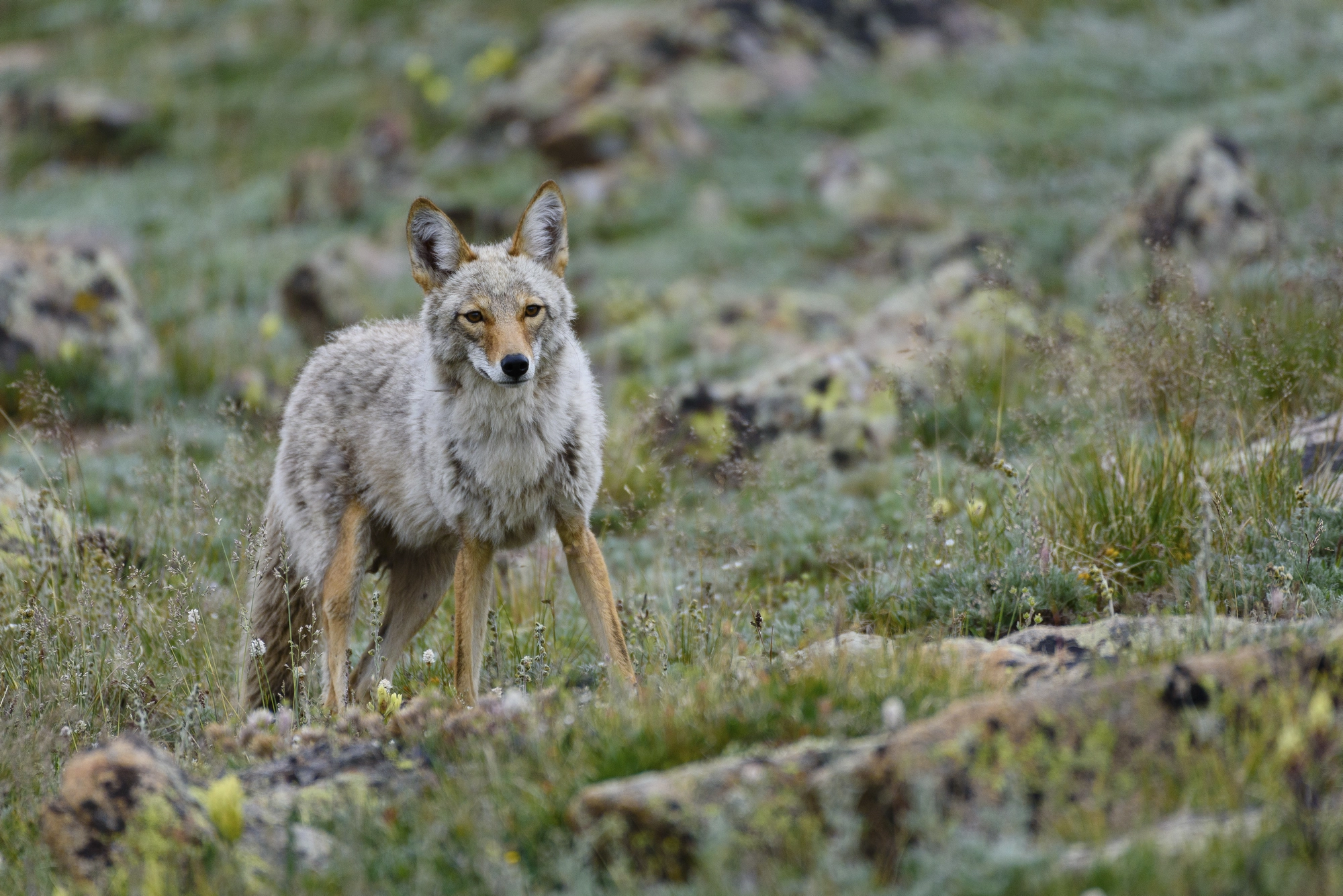 Not knowing what to think, as I had never seen a coyote in an alpine meadow before, we got out of the RV she had jokingly named Sonny and grabbed our cameras. Both of us had long lenses and focused on this amazing canine from about two hundred feet away. The coyote turned toward us as it searched among rocks and boulders in the willows. As it approached, we put some distance between us and it by edging closer to the RV, ready to dash back inside if needed.